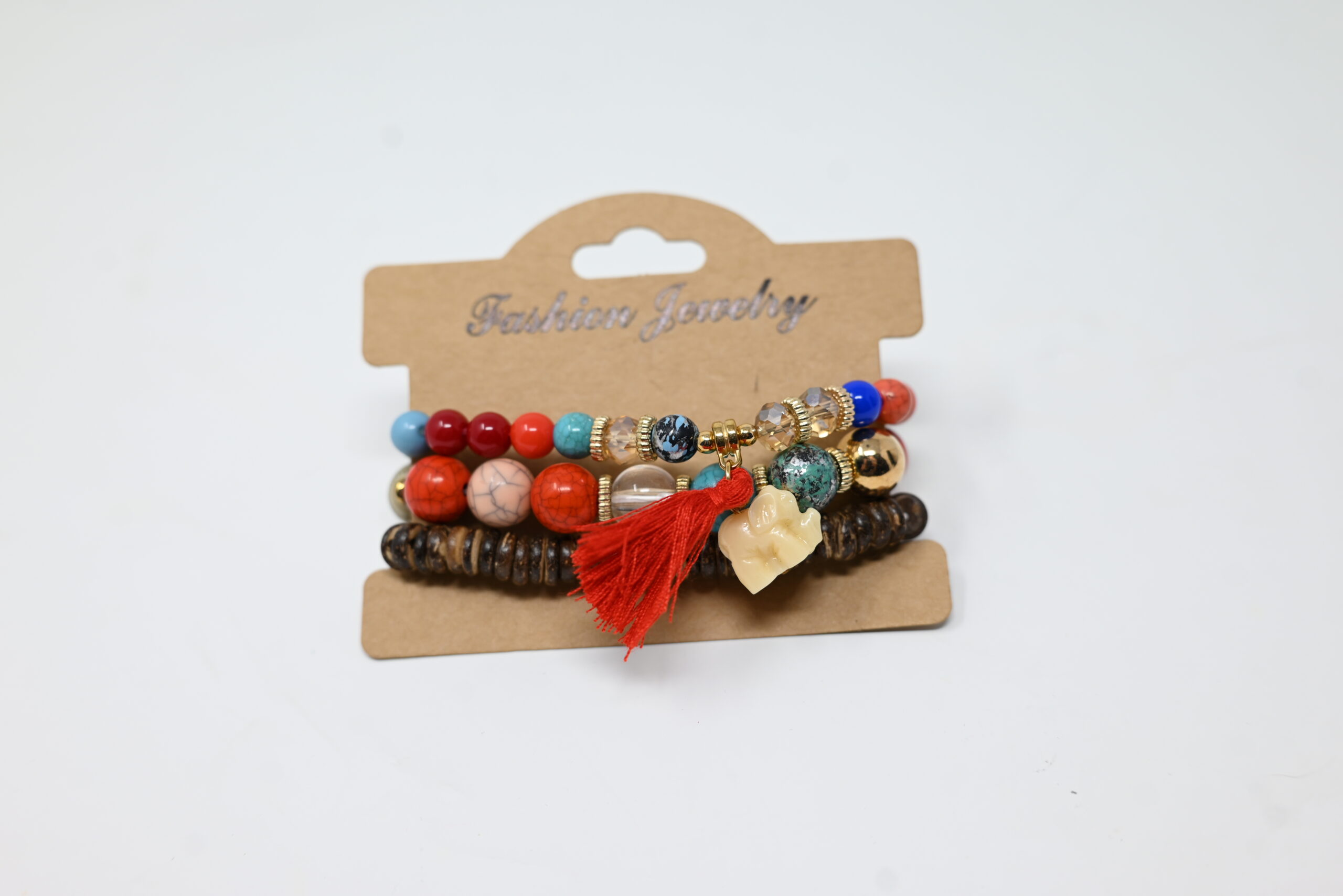 Vibrant and full of character, this Boho Spirit Bracelet Set brings together earthy textures and bold colors for a carefree, wanderlust-inspired style. The mix of turquoise, coral, gold, and marble-like beads is accented by a red tassel and a carved floral charm, giving each stack its own unique story.