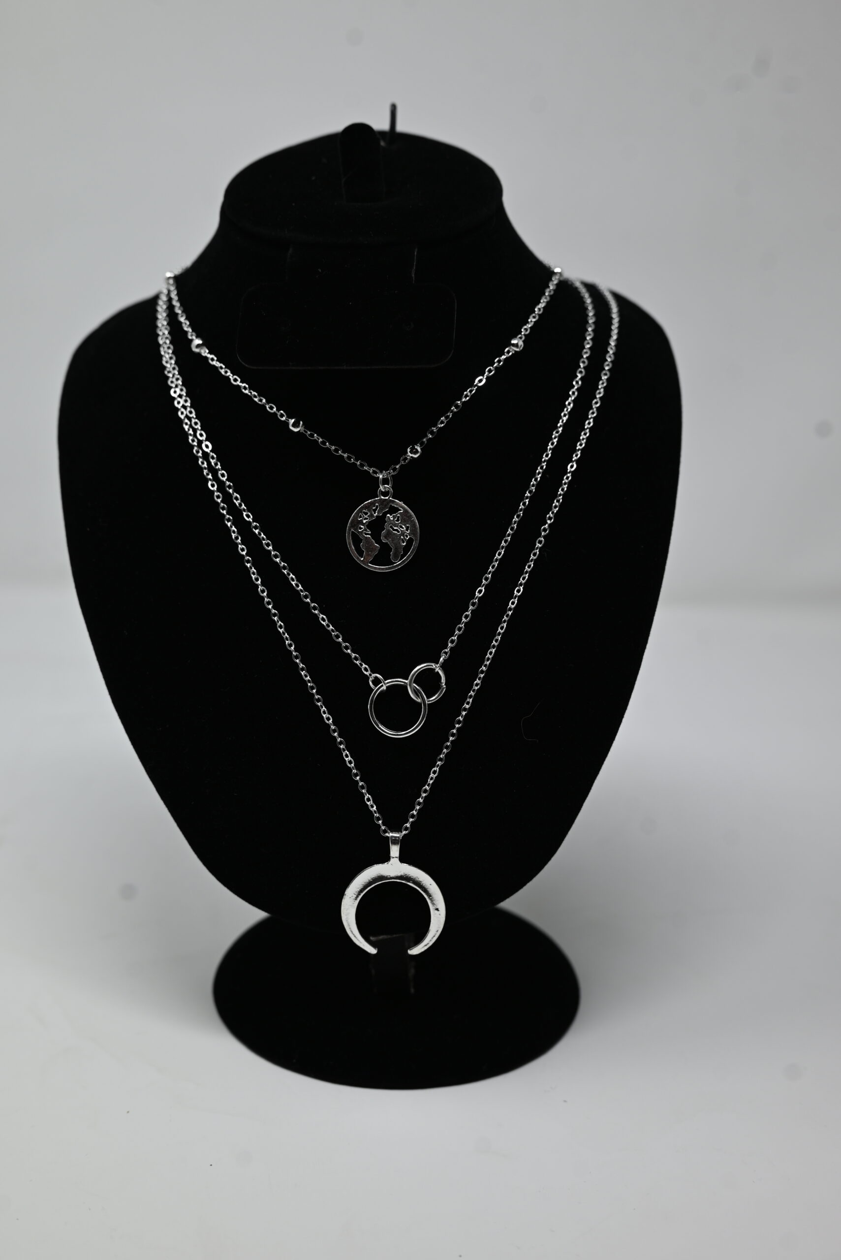 Shine with cosmic elegance. This three-layer silver necklace combines minimal charm with celestial symbolism — featuring a world pendant, interlocking rings, and a crescent moon. Each layer adds depth and meaning, perfect for free spirits, dreamers, and lovers of timeless style.