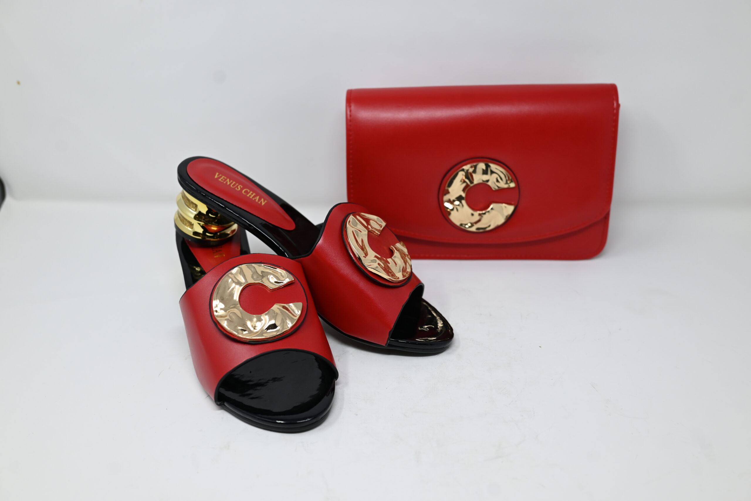 A statement of strength and style. This fiery red ensemble is elevated by striking gold crest emblems and a sculpted metallic heel. The sleek handbag and matching sandals are designed for the woman who commands attention with effortless elegance and confidence.