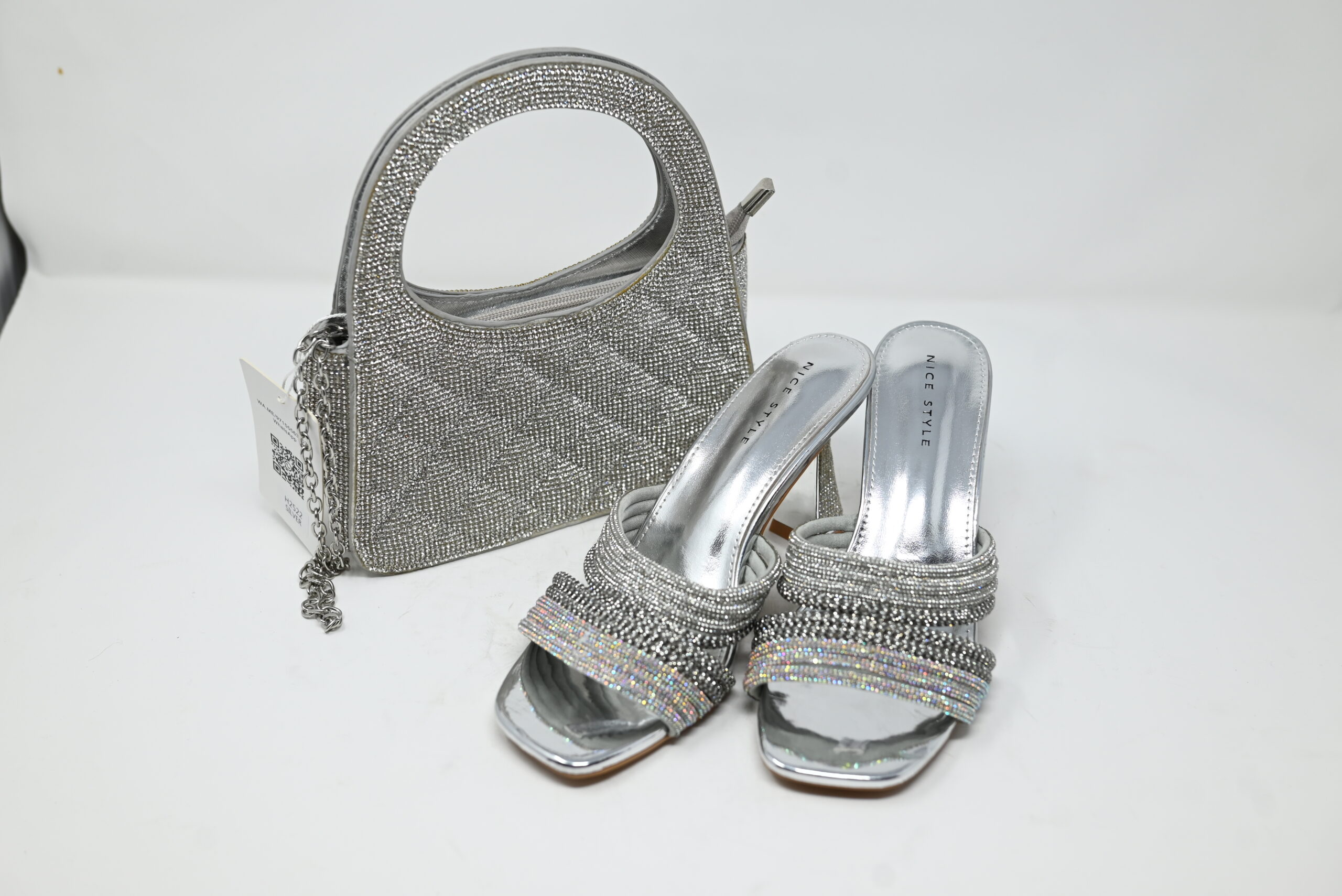 Sparkle with the Crystal Gleam Set—silver heels paired with a chic matching handbag, perfect for evening glamour and special occasions.