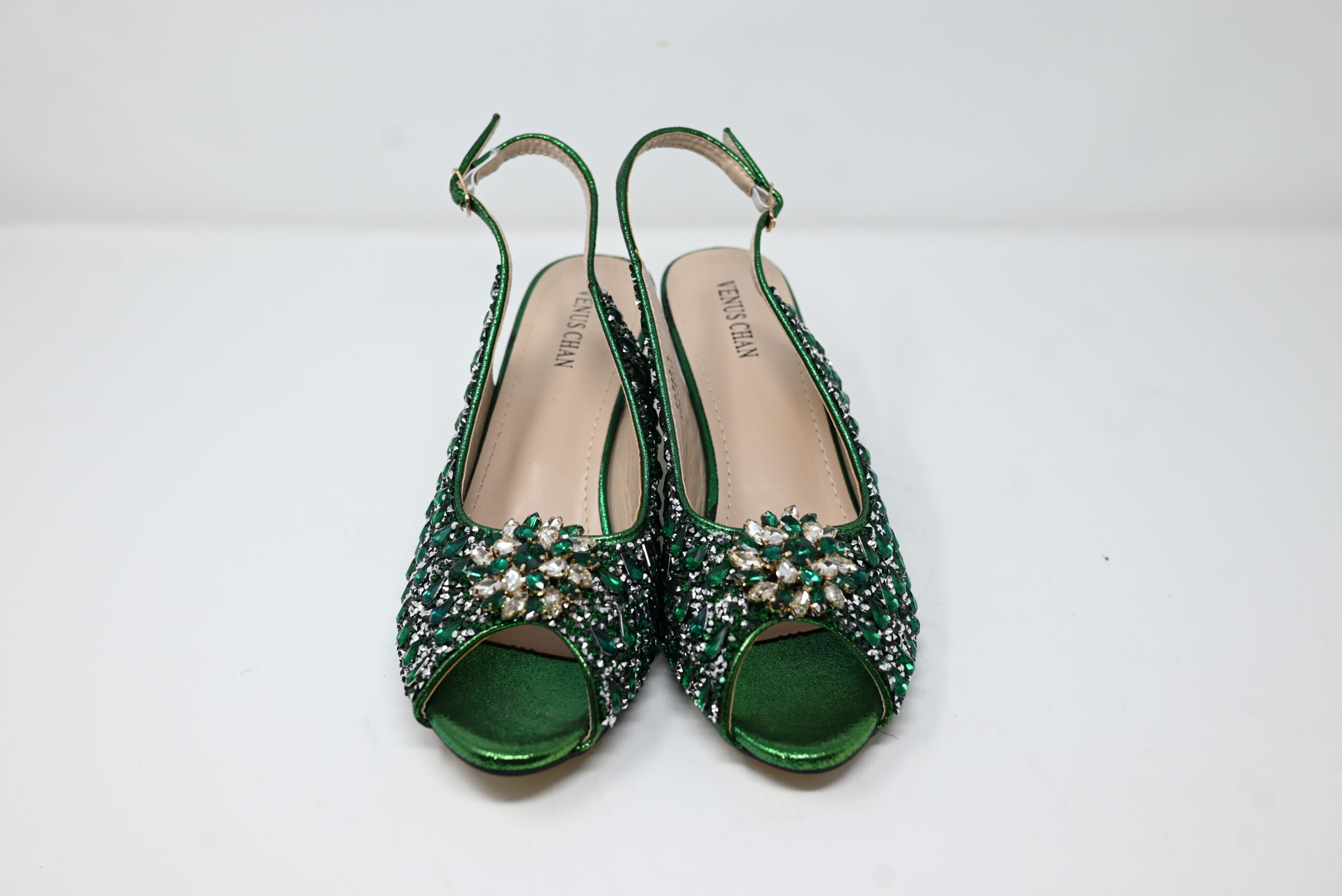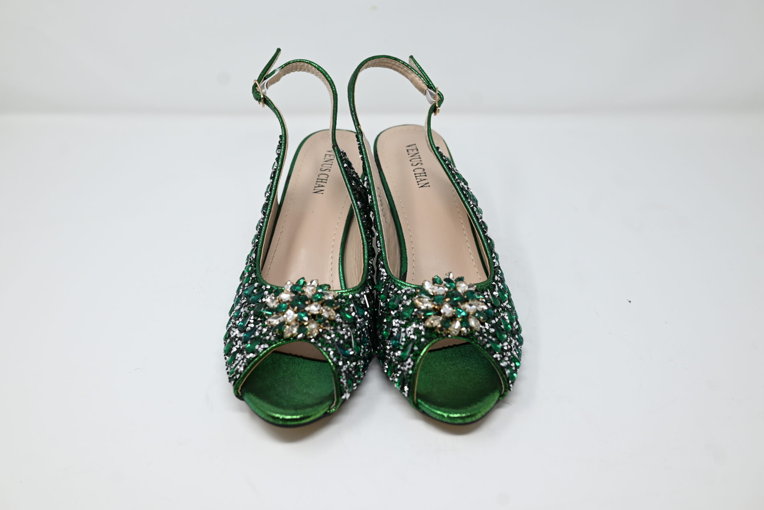 Shine with sophistication in the Emerald Bloom Heels. These open-toe slingbacks dazzle with intricate green and crystal embellishments, forming a floral centerpiece that radiates elegance. Crafted with a luxurious satin finish, they’re the perfect match for weddings, festive occasions, or any night you want to make unforgettable.