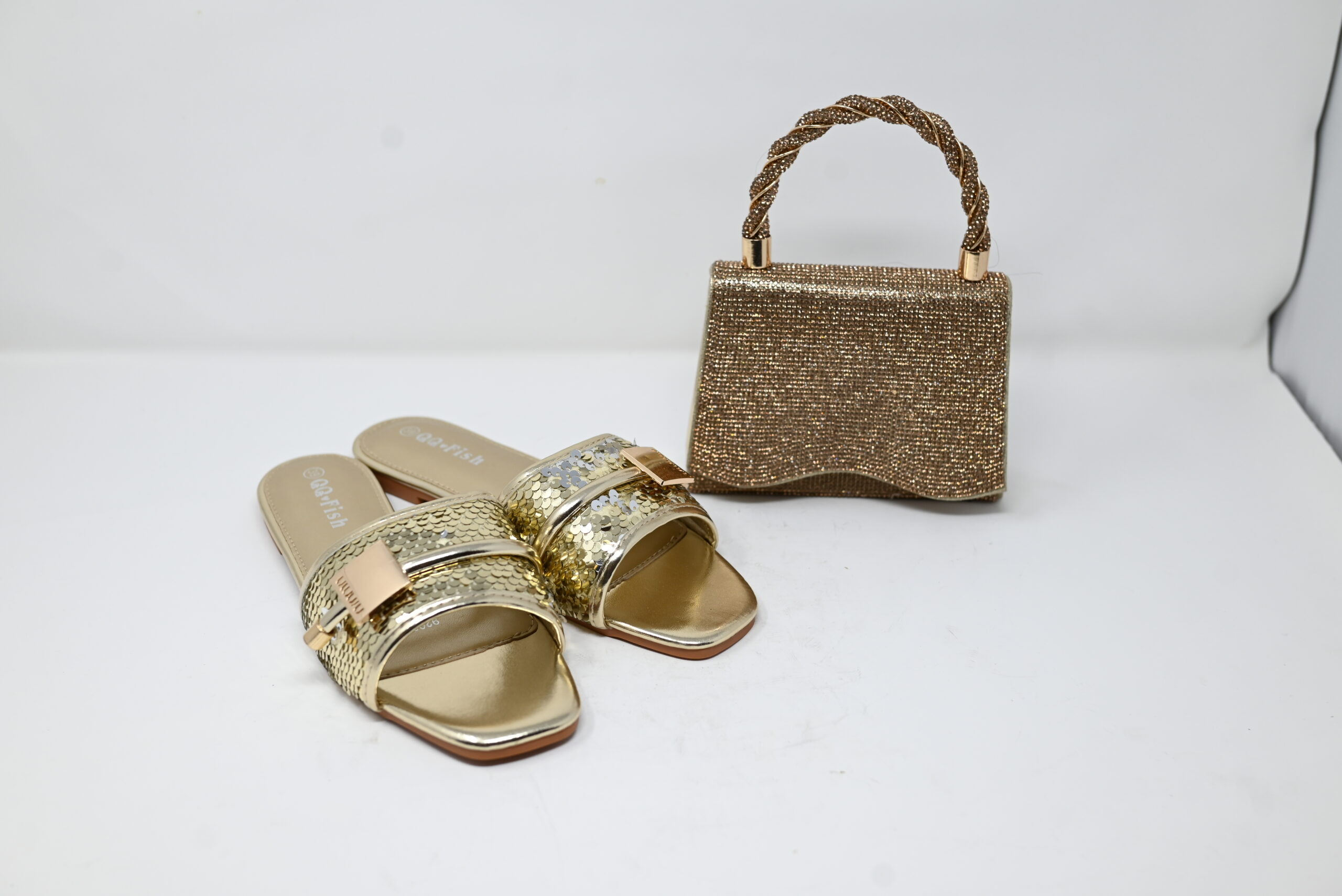 Radiating timeless elegance, this golden set pairs shimmering sequin-detailed slides with a sparkling structured handbag. The metallic tones and chic square design make it the perfect companion for evening parties, weddings, or festive occasions.
