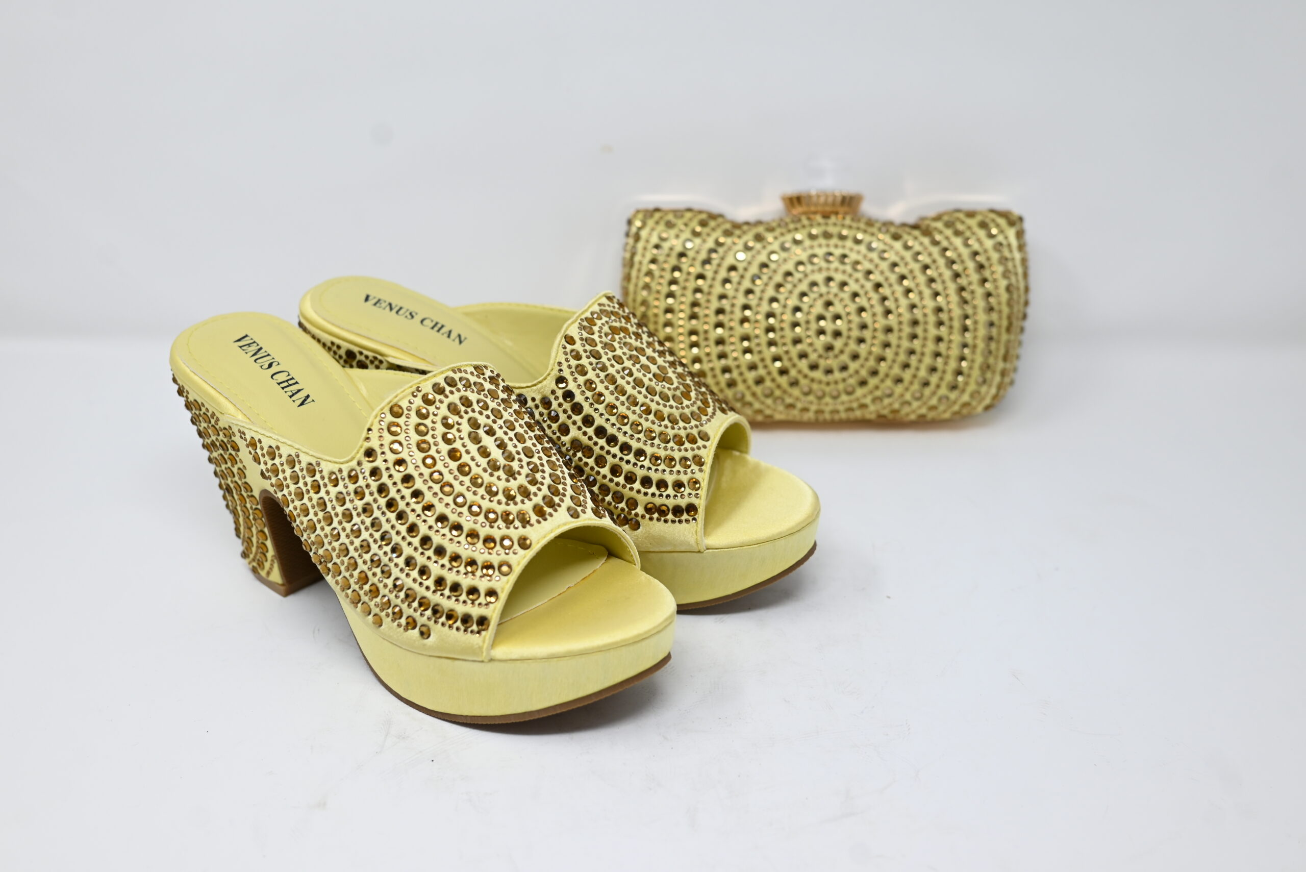 A bold and radiant design featuring golden heels and a matching clutch, embellished with hypnotic circular patterns of shimmering stones. This set adds a statement of glamour and modern elegance, perfect for evening occasions and festive celebrations.