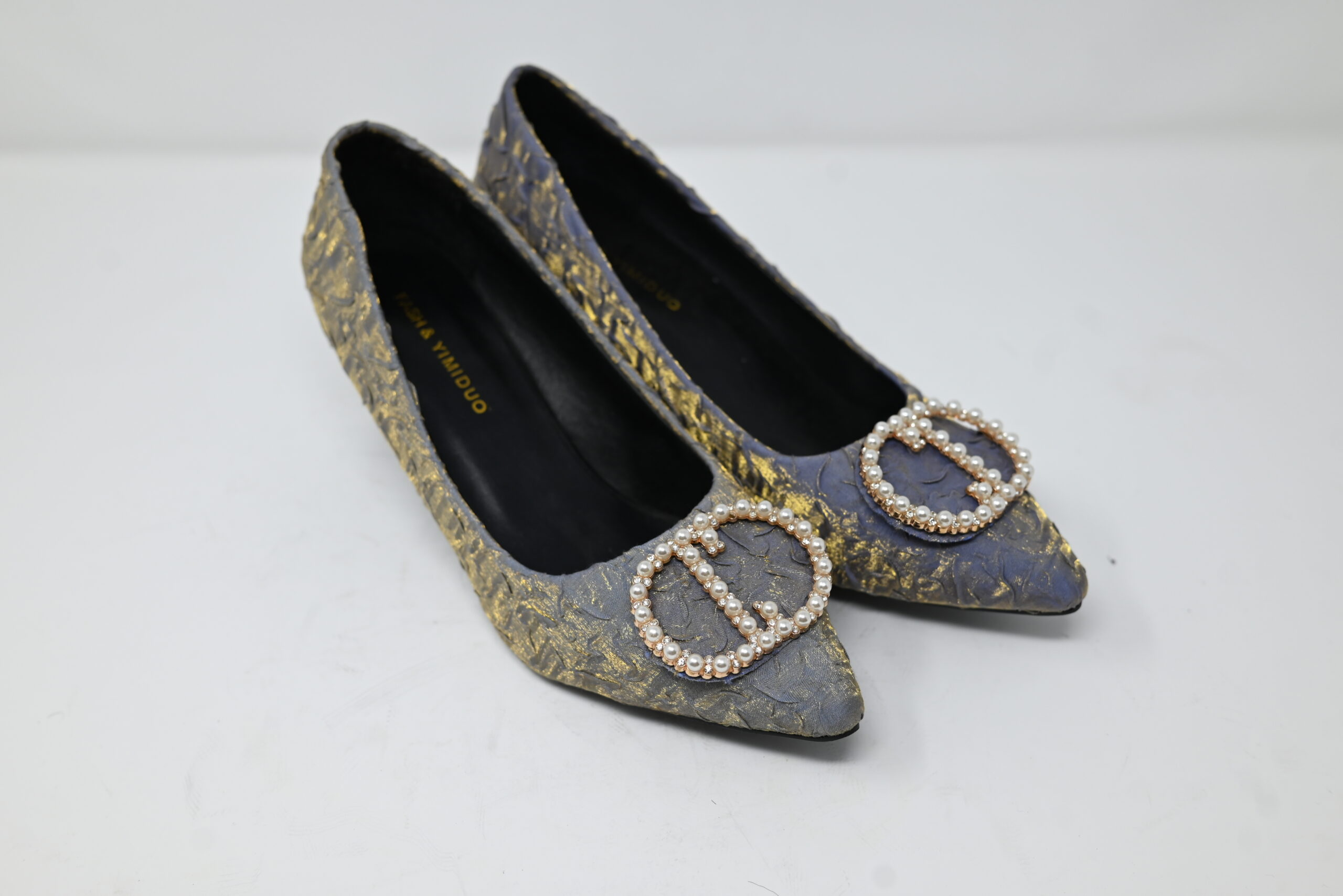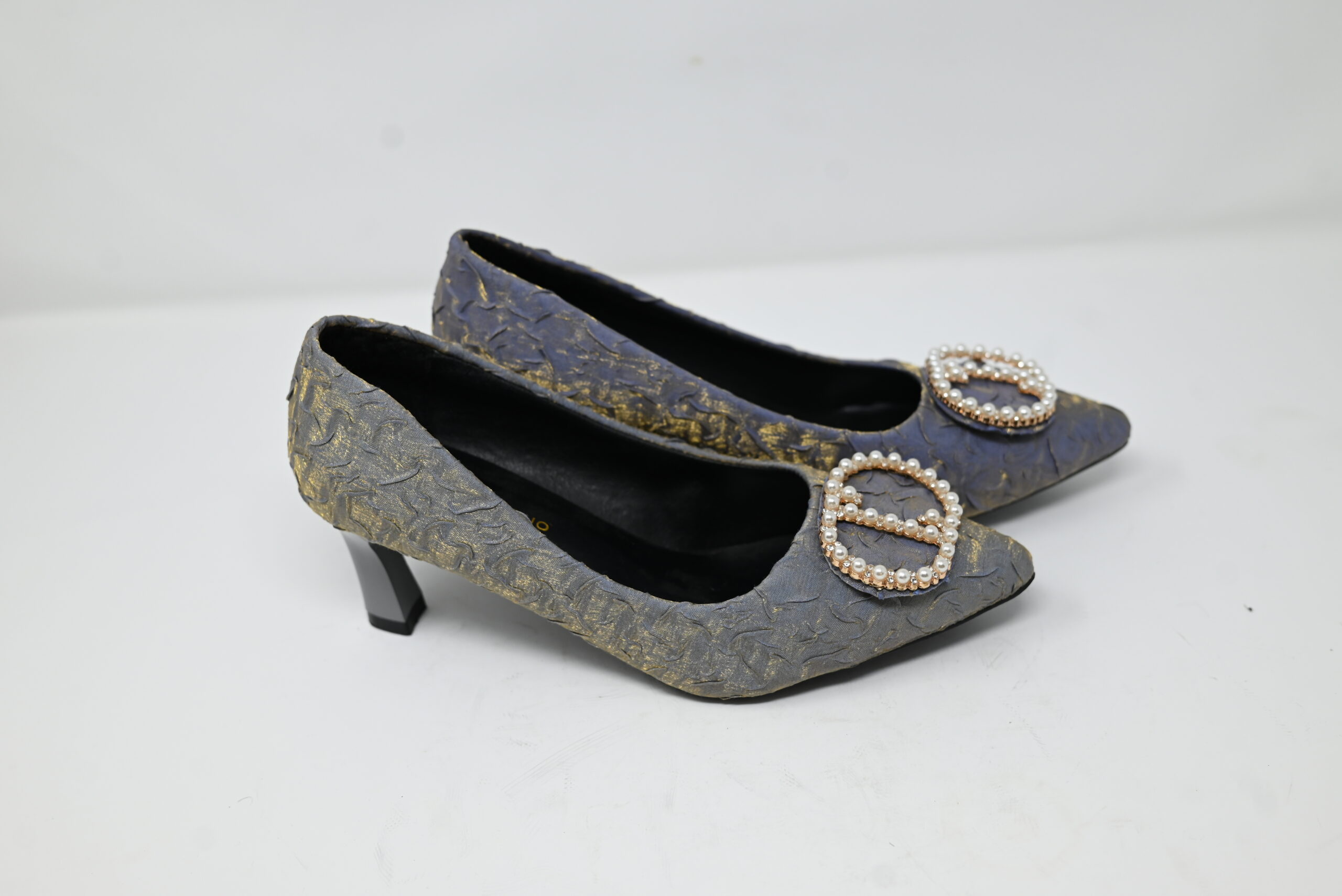Step into timeless elegance with the Midnight Pearl Heels. Designed with a textured deep blue-gold finish, these pointed-toe pumps are adorned with a statement pearl-studded buckle. A graceful mid-heel adds both comfort and sophistication, making them perfect for evening events, weddings, or any occasion that calls for classic charm.