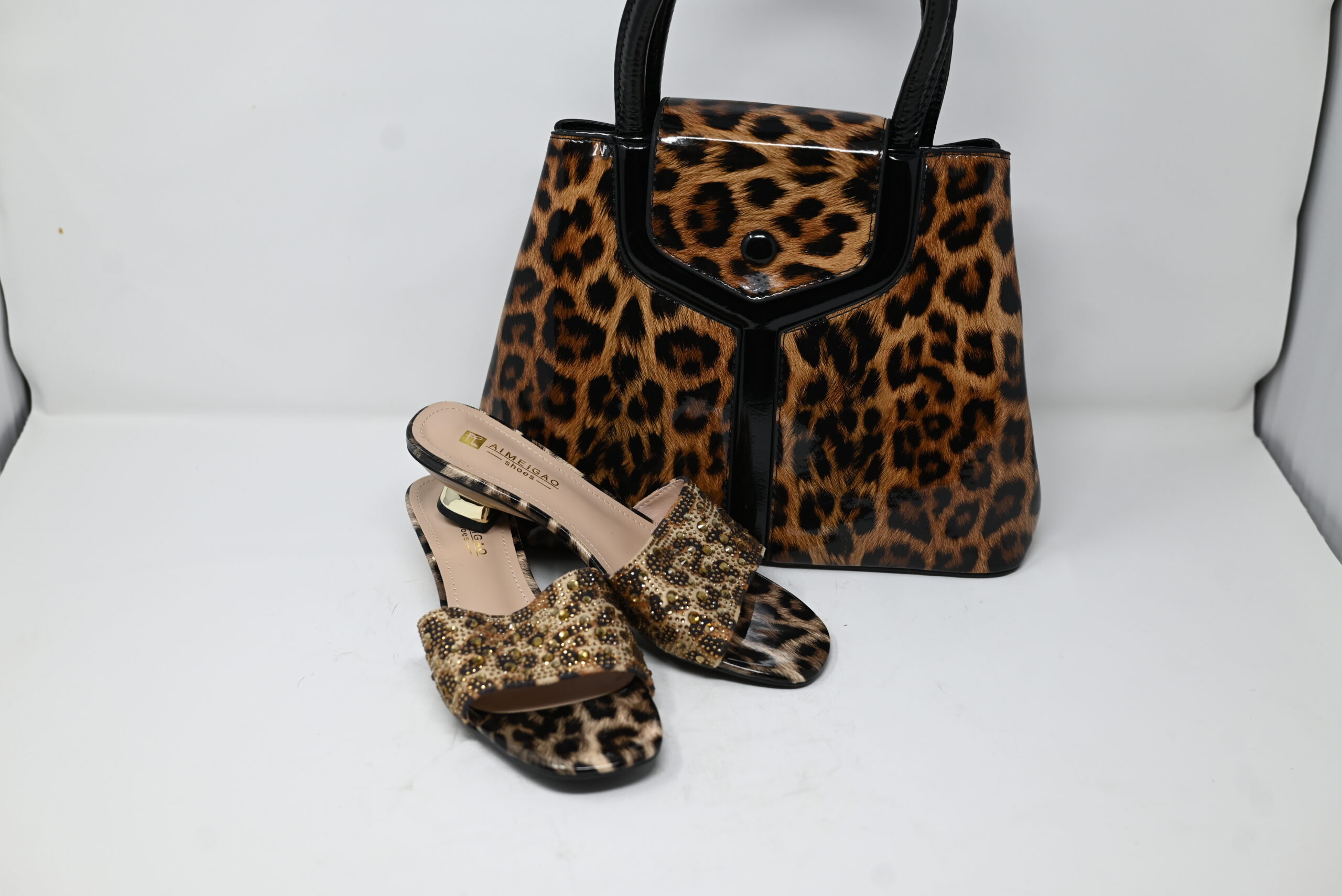 Step out in confidence with this striking leopard-print handbag and matching jeweled slides. Designed for the fierce and fashionable, the set radiates wild elegance—perfect for making a statement whether at a night out, a chic gathering, or a power lunch.