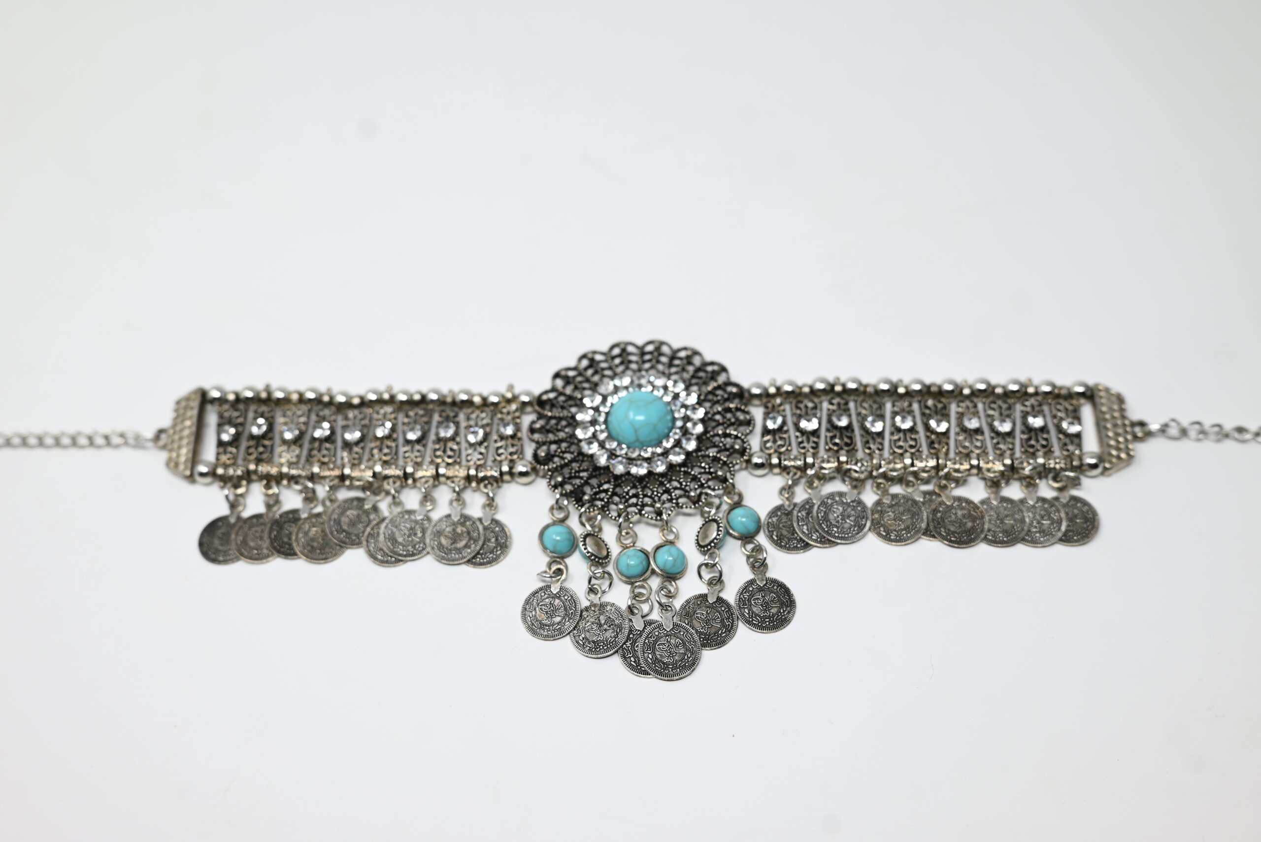 A true statement piece, the Turquoise Coin Boho Bracelet exudes vintage charm with its intricate detailing and bold centerpiece. This silver-toned bracelet features a large turquoise stone, ornate metalwork, and dangling antique coin charms, creating a stunning, gypsy-inspired look. Perfect for festivals, photoshoots, or adding a bohemian edge to your outfit.
